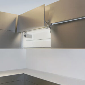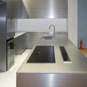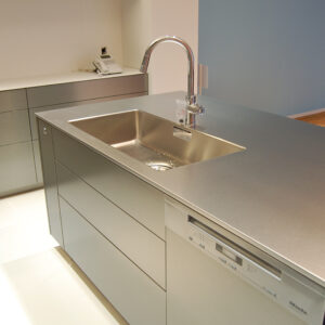 全ての部材をステンレスの質感に合わせ、究極の統一感を実現しました。エッジの効いたシャープなフォルムが、光を美しく反射し、キッチンを一つの芸術品へと昇華させています。機能美を追求した先に辿り着いた、潔いまでの美しさがここにあります。