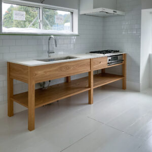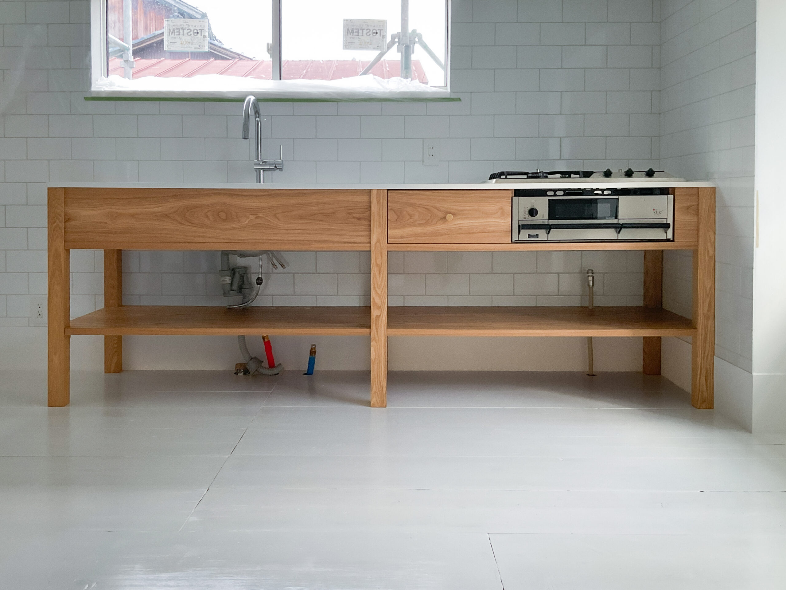 余計な装飾を削ぎ落とし、素材そのものの良さを活かしたミニマルなキッチンです。シンプルな作りだからこそ、表面にビスを出さない緻密な組み上げ技術がその美しさを支えています。クオーツストーンの天板が洗練された印象を与え、使い込むほどに愛着の湧く、機能美に満ちた一台が完成しました。