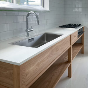 ・製作物 キッチン ・天板 クオーツ 20mm ・扉材 タモ突板塗装 ・建築地 福井